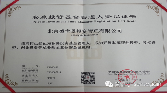 2014年4月,盛世景获得中国证券投资基金业协会颁发的《私募投资基金管理人登记证书》,正式登记为私募投资基金管理人,成为开展私募证券投资、股权投资、创业投资等私募基金业务的金融机构。